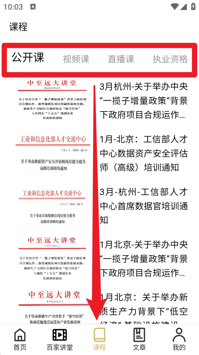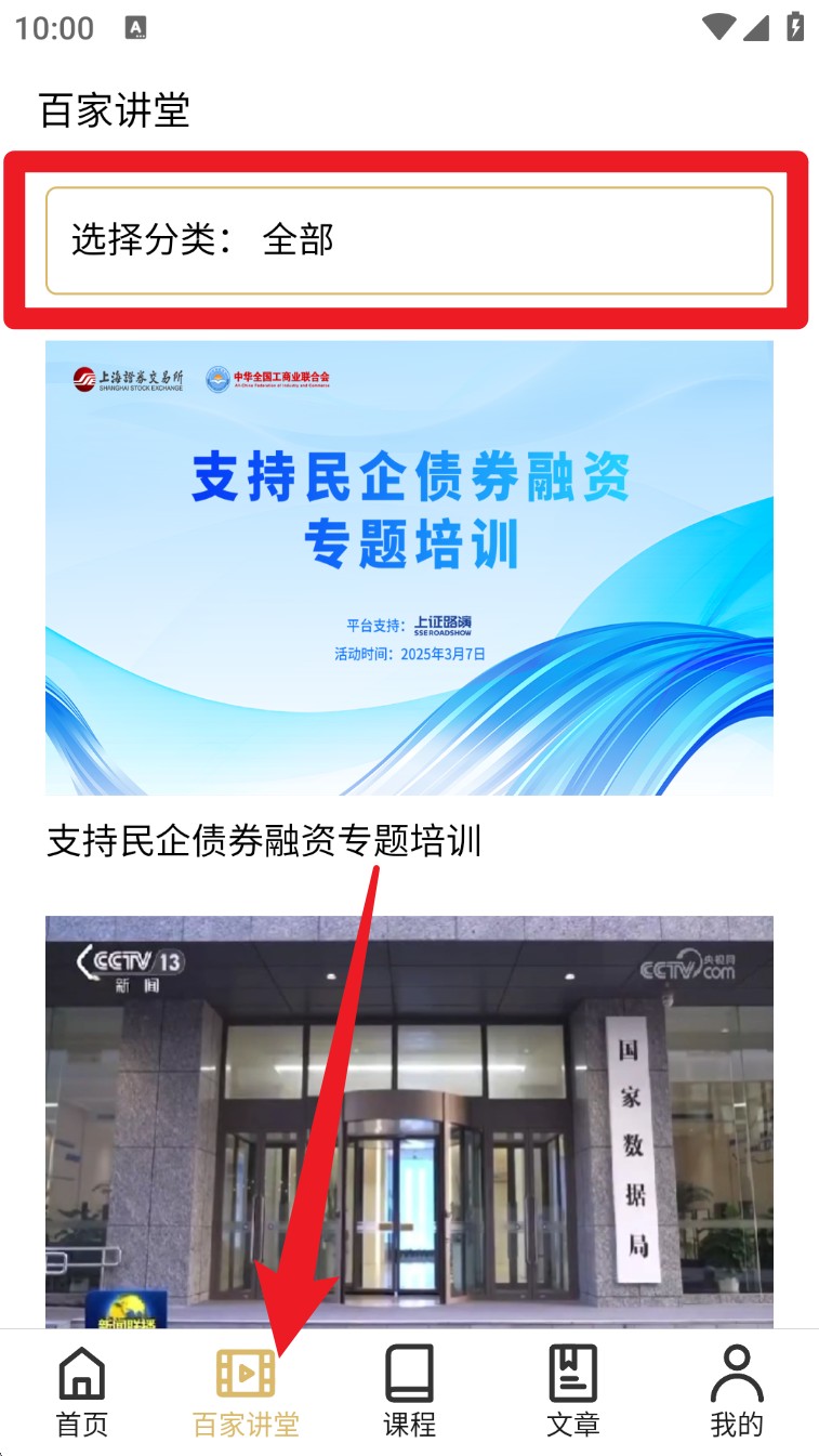 3. 点击底部导航「百家讲堂」,进入后可选择分类筛选专题视频,观看对应培训课程。