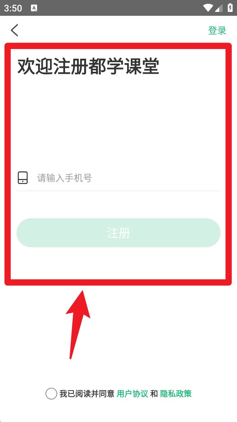 1. 打开App,进入注册页面,输入手机号后点击「注册」。首次登录需勾选同意下方的用户协议与隐私政策,完成后即可创建账号。