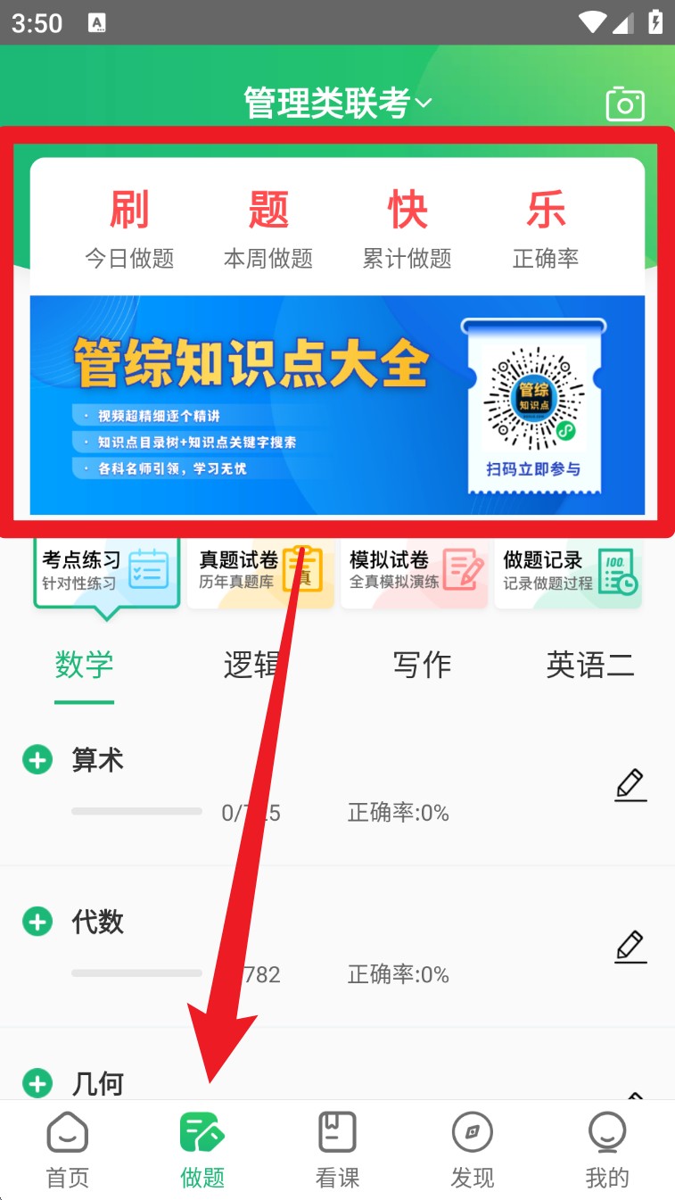 5. 进入「做题」栏目后可选择刷题类型,包括考点练习、真题试卷、模拟卷等,并记录自己的答题正确率与进度。