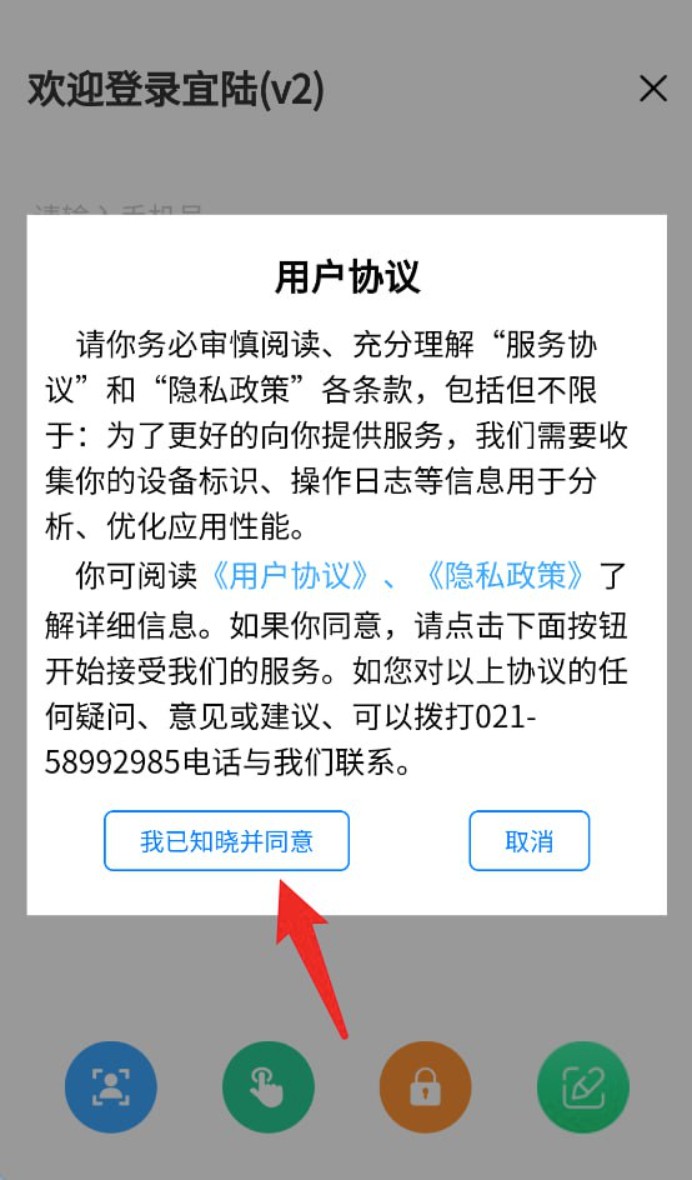 1. 打开 App 后会弹出用户协议提示,请先点击“我已知晓并同意”以继续操作。