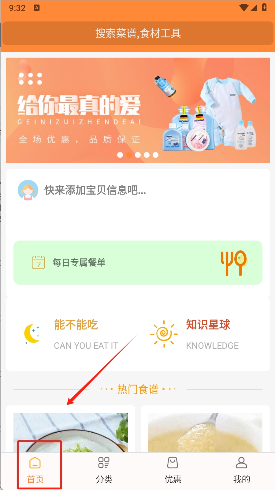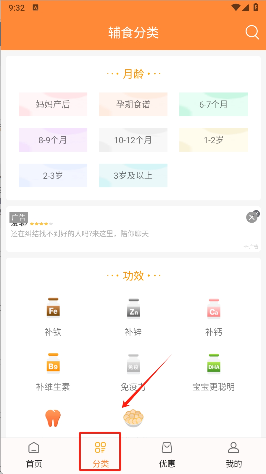 1、在首页点击底部导航栏的“分类”图标,进入分类页面。这样可以查看不同月龄和功效的辅食分类。
