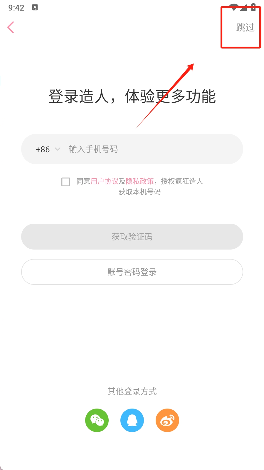 1、第一步:打开疯狂造人软件,点击右上角的“跳过”按钮,跳过登录页面。这样可以快速进入软件的主功能界面。