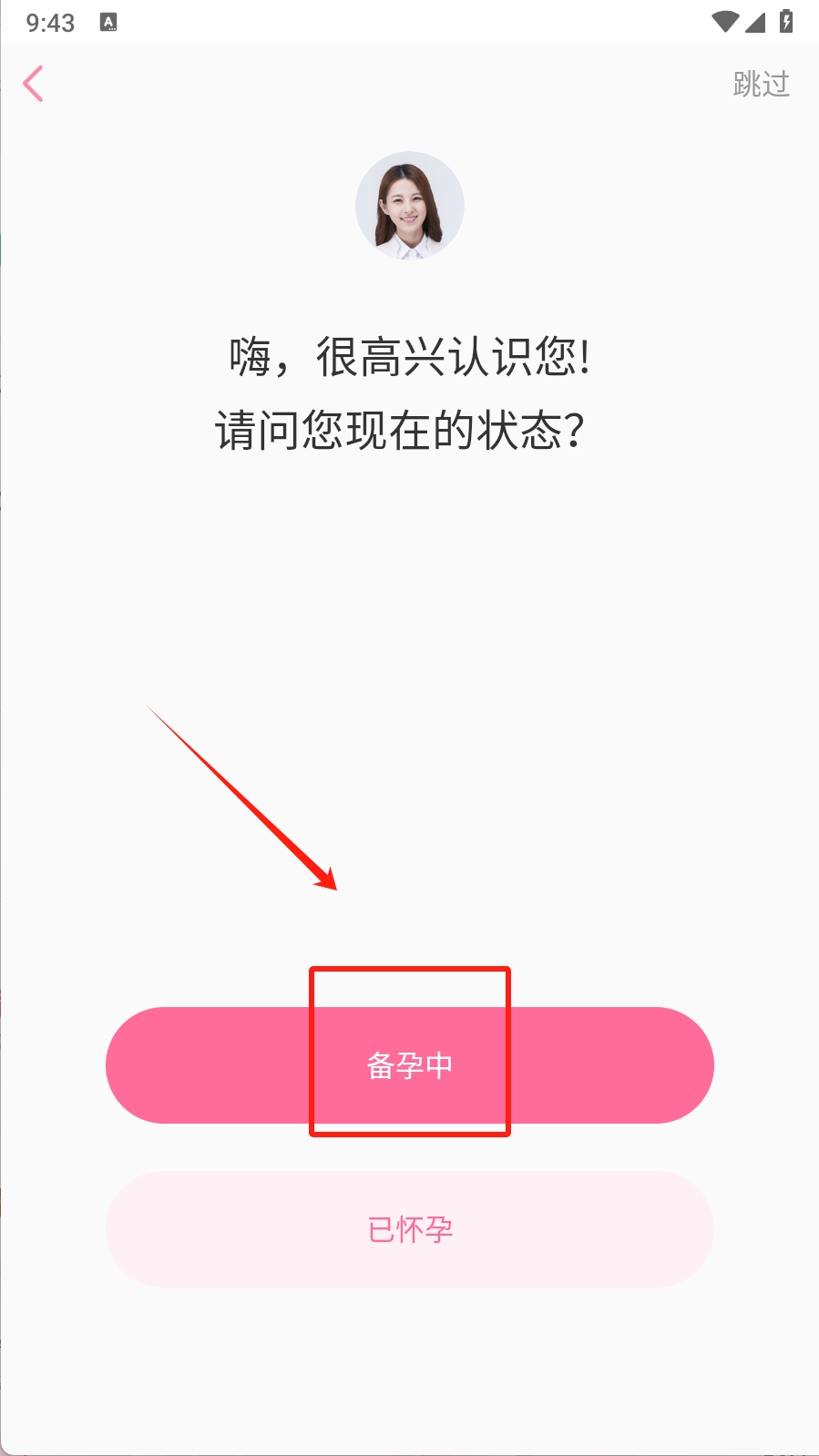 2、第二步:在欢迎页面,选择“备孕中”按钮,进入下一步。这一步是为了确认您的当前状态,以便软件提供更个性化的服务。