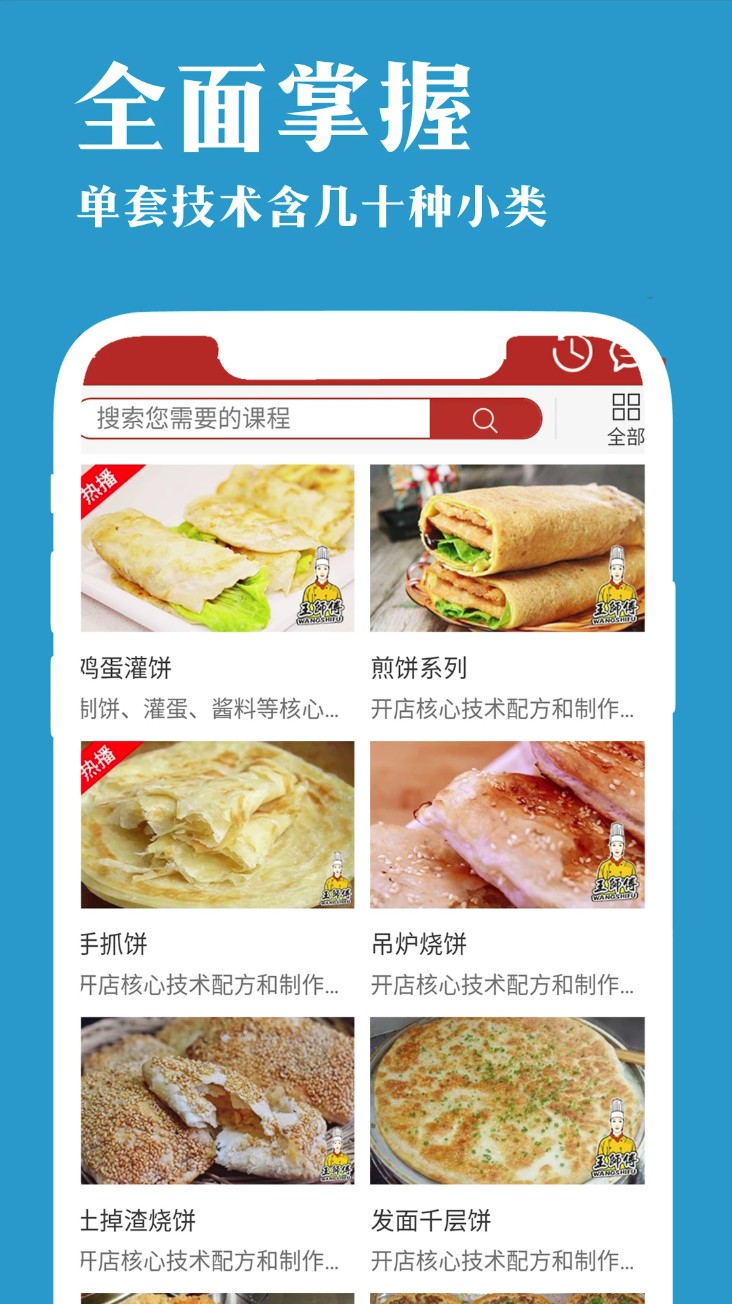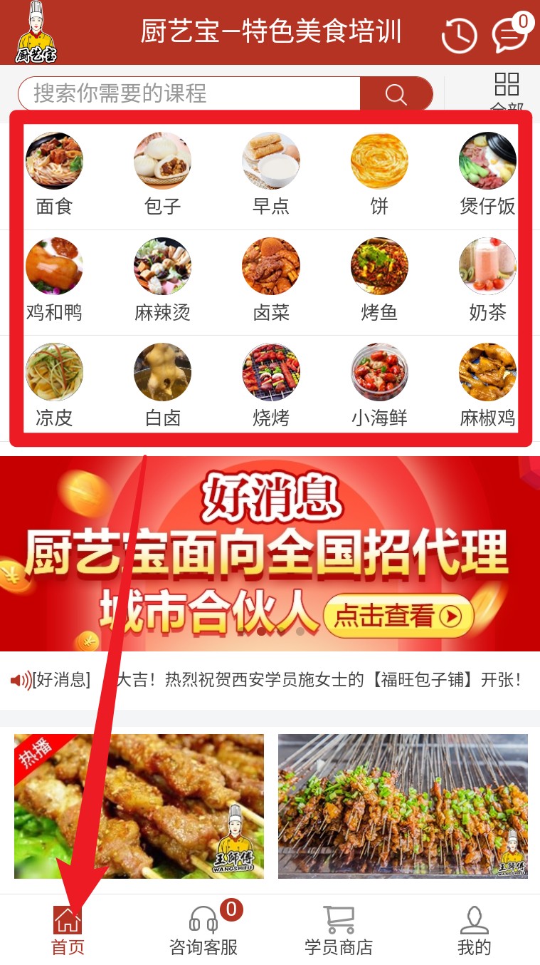 1. 打开 App 进入首页,点击课程分类图标即可浏览面食、早点、小吃等不同培训模块。