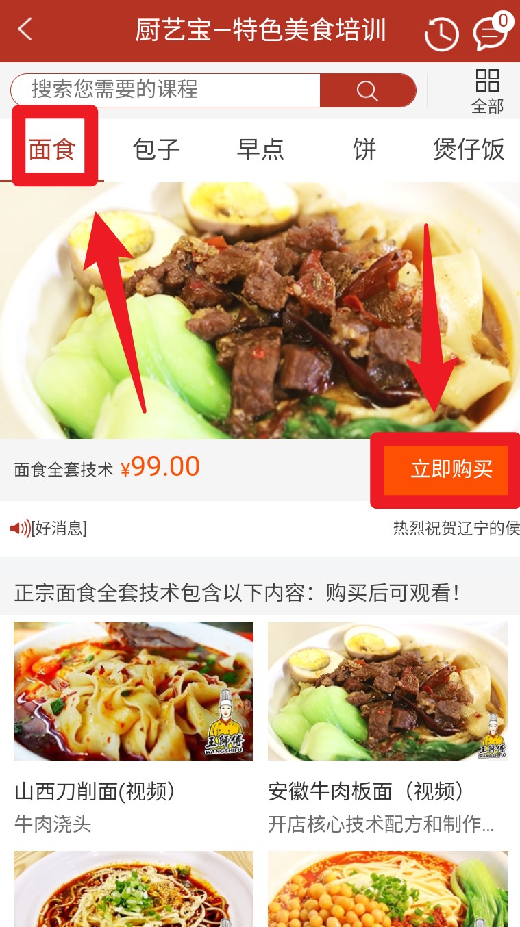 2. 点击任一课程分类(如“面食”),可查看对应内容详情与视频介绍,并支持立即购买。