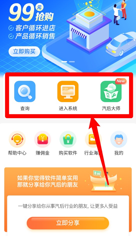 2、登录成功后点击“进入系统”,可选择使用汽车后业务模块。