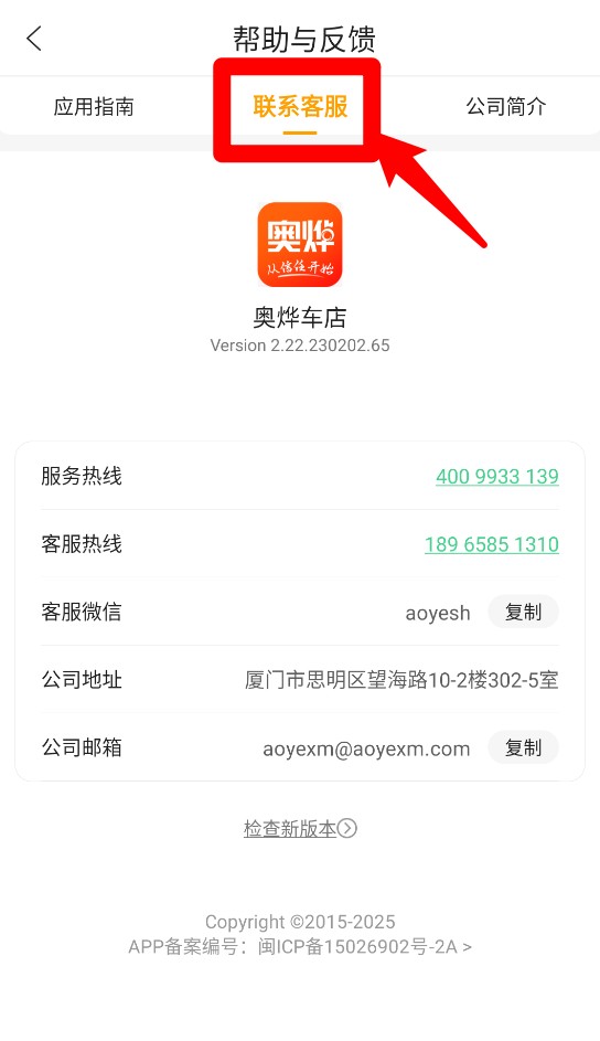 4、切换至“联系客服”页可查看服务热线、微信及公司联系方式。