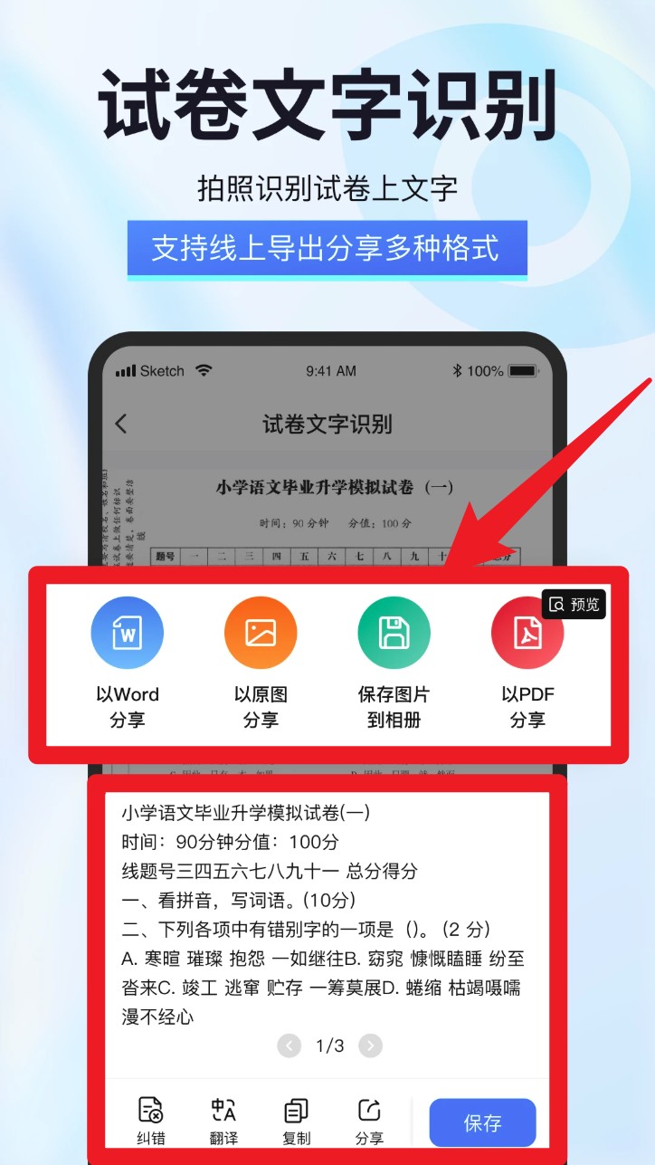 2. 切换到“试卷文字识别”页面,系统将自动识别试卷内容,并支持以 Word、图片或 PDF 格式导出保存。