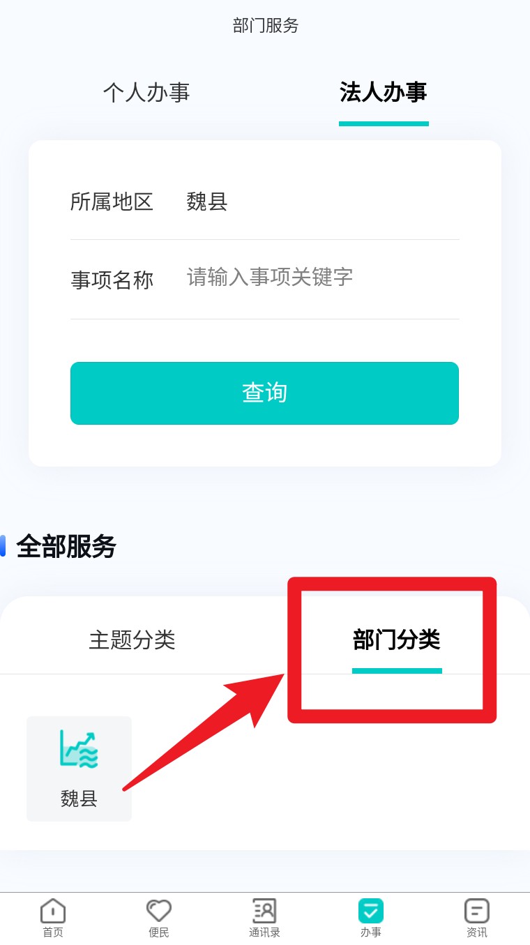 4. 在“办事”界面切换到“法人办事”标签页,支持按主题分类或按部门分类快速查找所需服务。