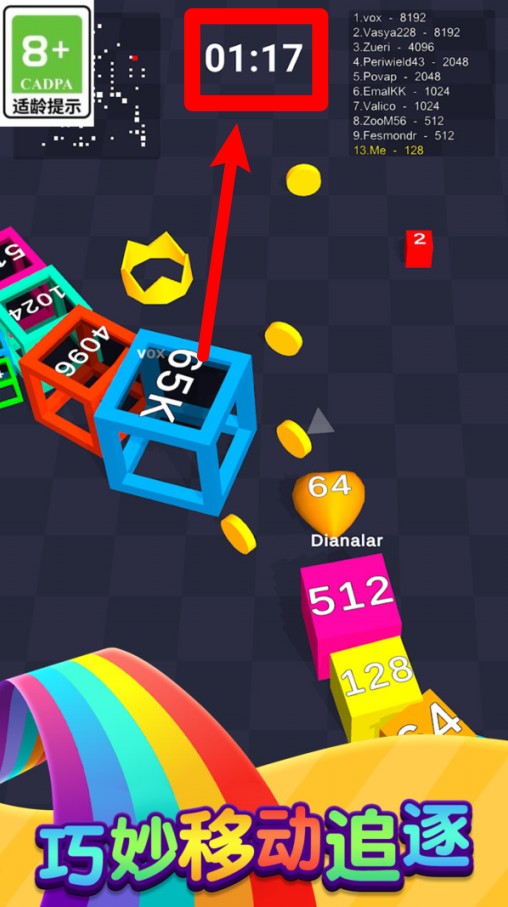 1.图中01:17代表游戏当前局进行时间,提示你在这一局中已经坚持的时间。