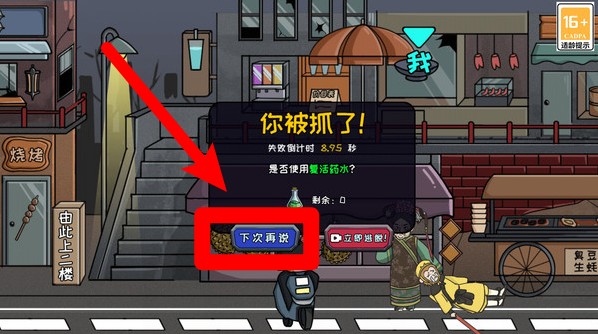 3.点击「下次再说」,那就只能放弃立即逃脱,等待下一局的机会,不然就只能眼睁睁看着敌人把你带走。