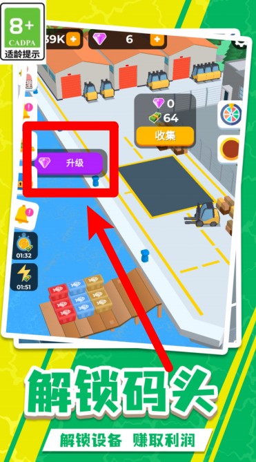 3.点击升级按钮提升货物搬运能力,赚取更高利润,效率翻倍。