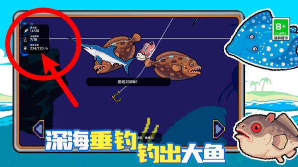 2.左上角显示鱼线数量(当前/总数),鱼饵数量(当前/总数),鱼线深度(当前/最大深度)关注三项数据变化。