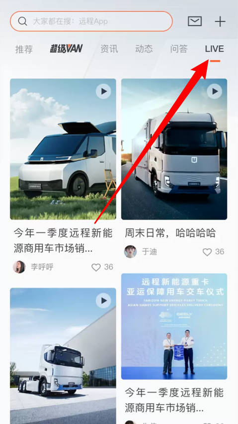 3.进入LIVE板块,查看各类新能源车辆的推荐视频内容并参与互动。
