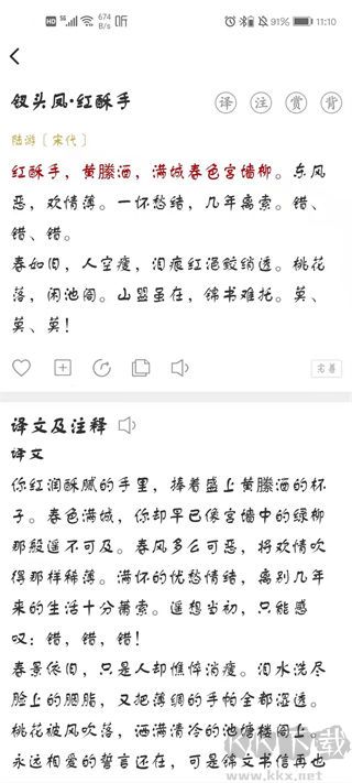 1、详情查看:详情页内容详尽,支持同步查看注解、译文和赏析。