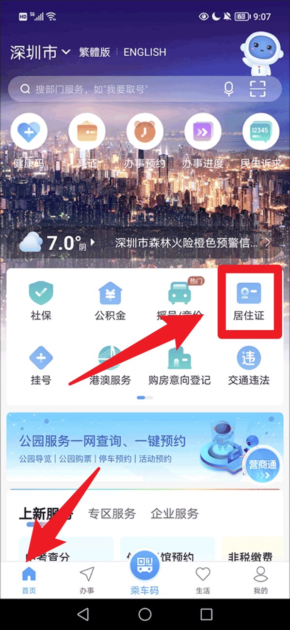 1. 打开 i深圳 App,在首页滑动图标找到「居住证」图标,点击进入居住证业务页面。