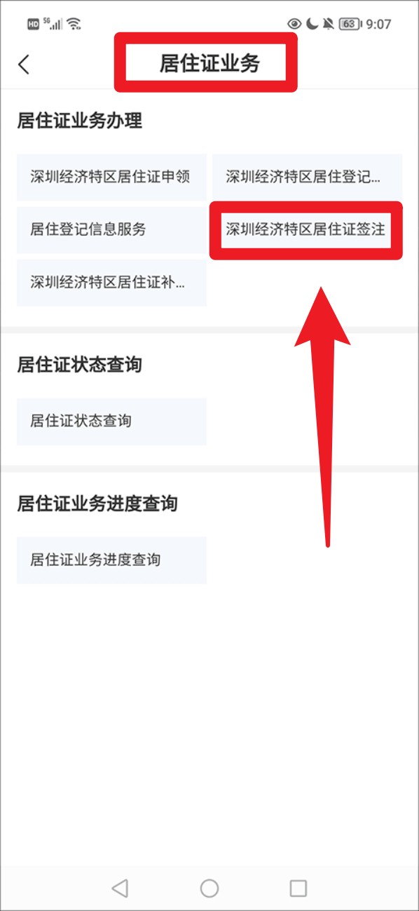 2. 在页面上选择「深圳经济特区居住证签注」选项,准备开始线上办理流程。
