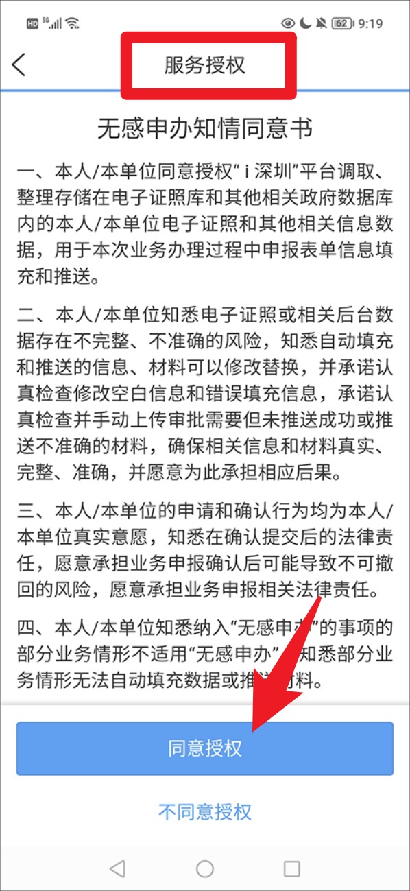 3. 系统会跳出《无感申办知情同意书》,认真阅读后点击底部蓝色按钮「同意授权」。