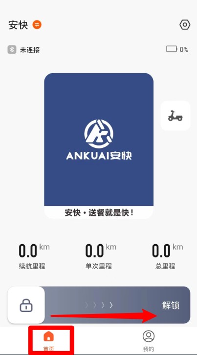 4、点击底部“首页”图标右滑可解锁设备,开始骑行操作流程。