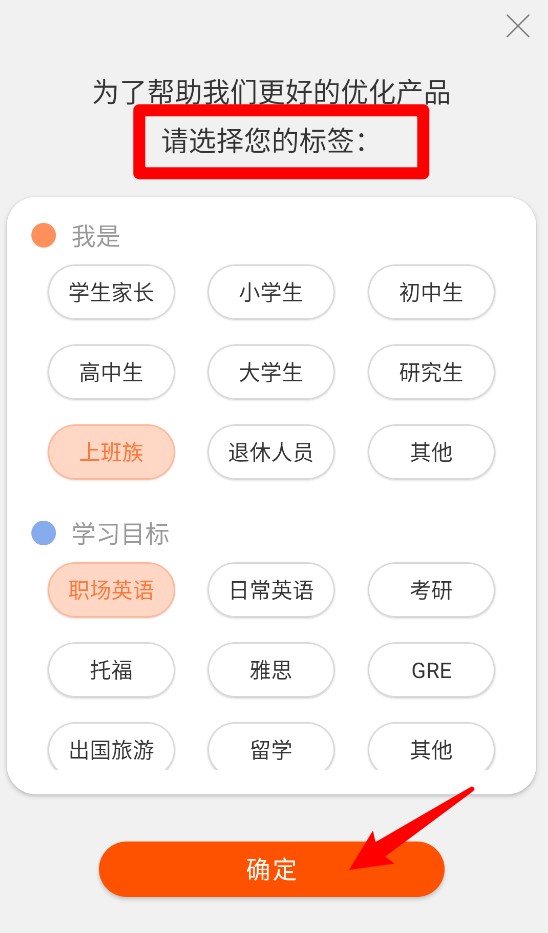 1、首次使用需选择身份与学习目标,例如“上班族”和“职场英语”,点击“确定”完成初始设定。