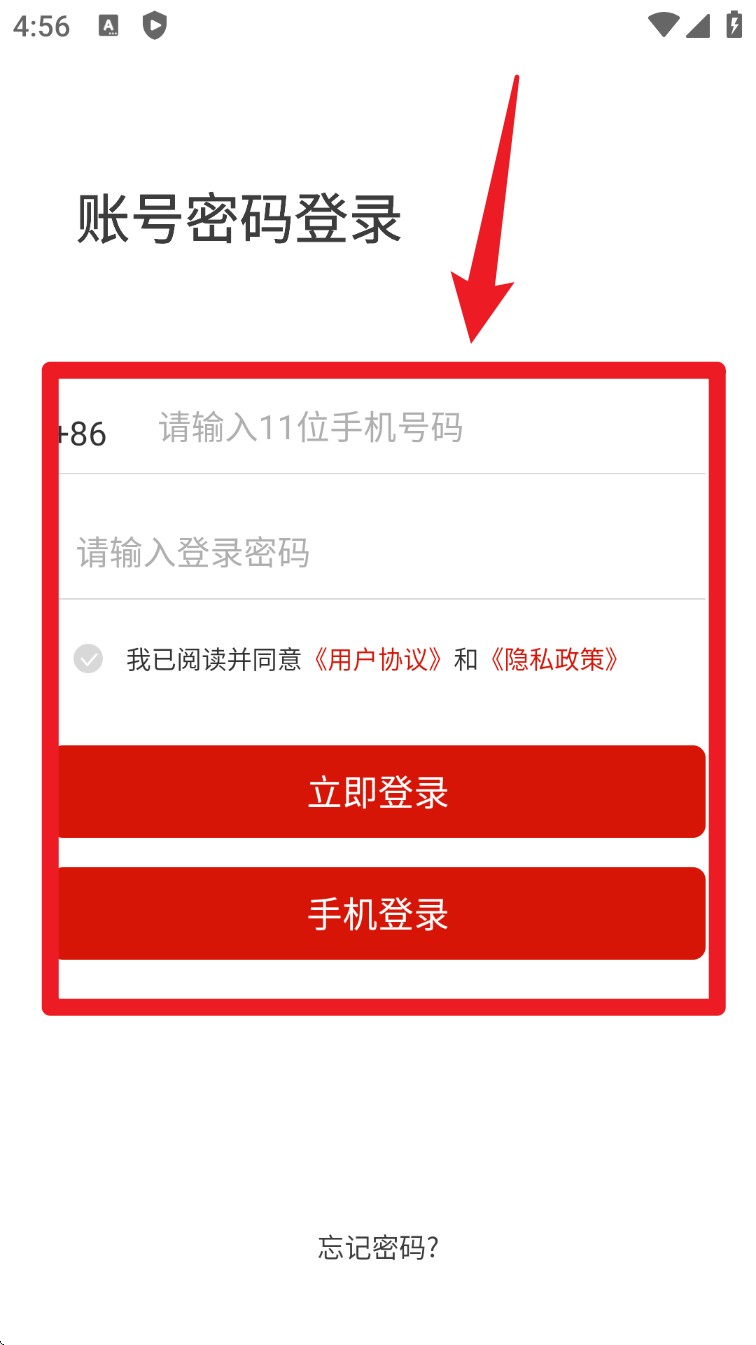1. 打开 App 后点击“账号密码登录”,输入手机号与密码,勾选协议后点击“立即登录”。