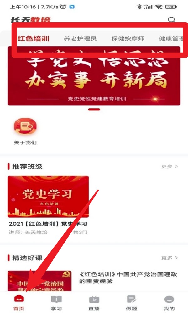 3. 登录成功后,在首页顶部选择你感兴趣的培训类别,如“红色培训”或“养老护理员”等。