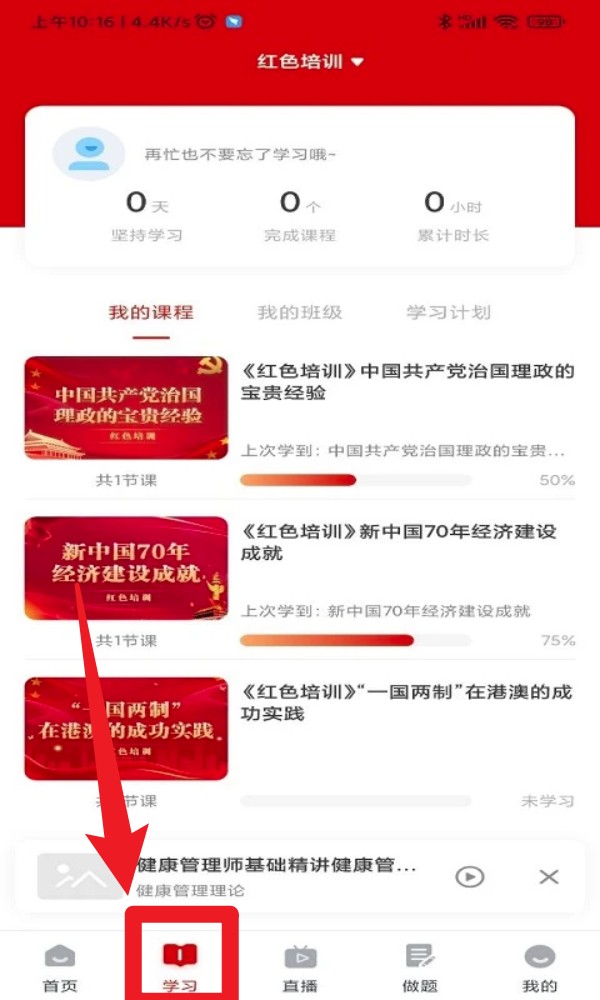 4. 点击底部“学习”栏目,进入课程播放页,查看视频内容和当前学习进度。