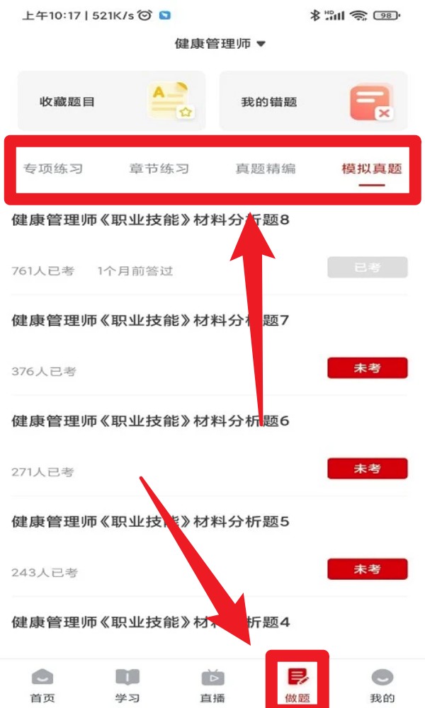 5. 进入“做题”功能,选择“专项练习”或“模拟真题”,随时巩固所学内容并记录答题情况。