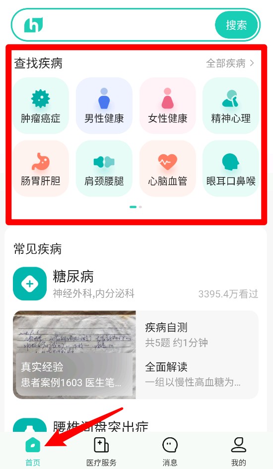 1、在首页可根据分类查找疾病信息,包括肿瘤癌症、男性健康、女性健康、精神心理等多个领域的内容入口。