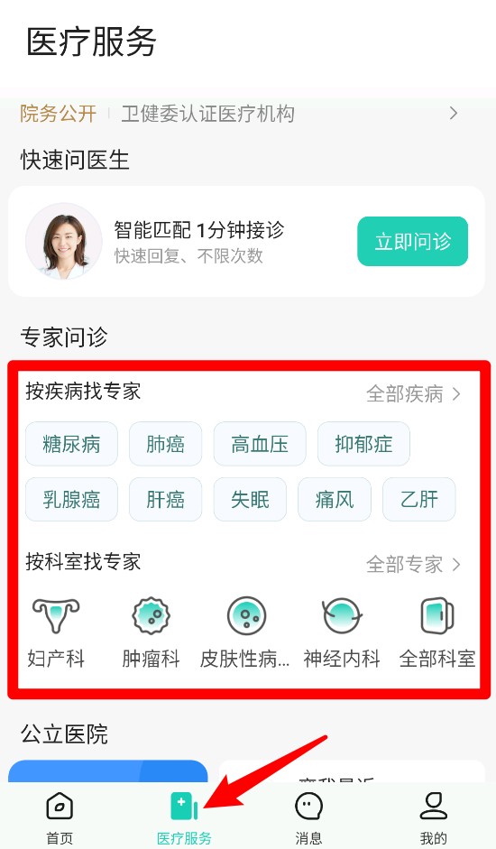 2、点击下方“医疗服务”可快速匹配医生,支持按病症或科室查找专家进行在线咨询服务。