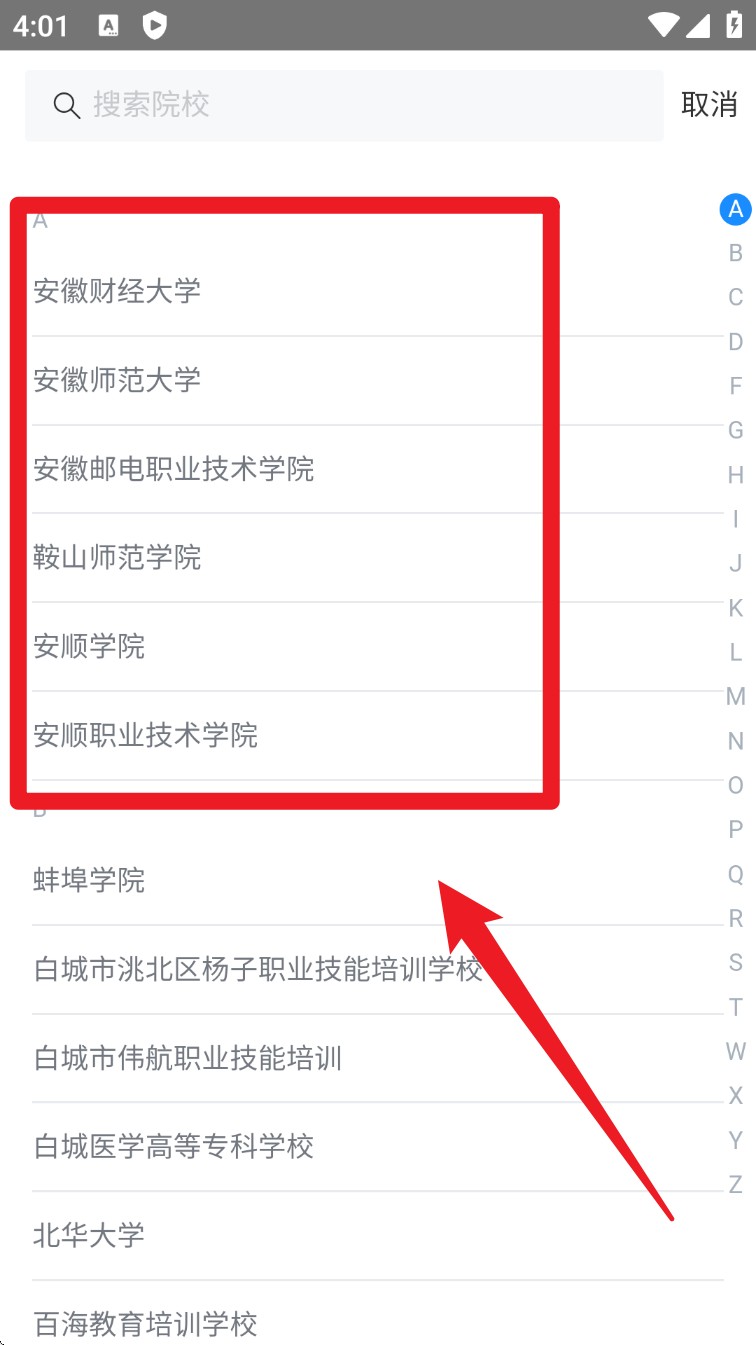 1. 首次使用需选择所属院校,点击页面顶部搜索栏输入学校名称,或按字母顺序手动查找后点击选中。