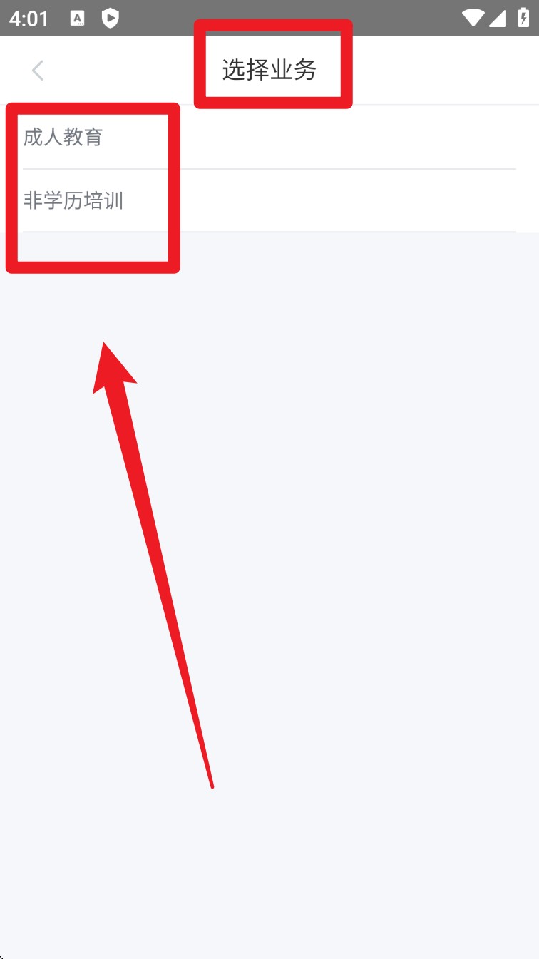 2. 进入“选择业务”页面后,点选对应类别如“成年人教育”或“非学历培训”,系统将绑定业务权限。