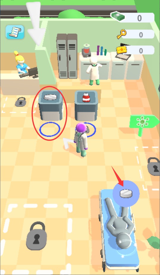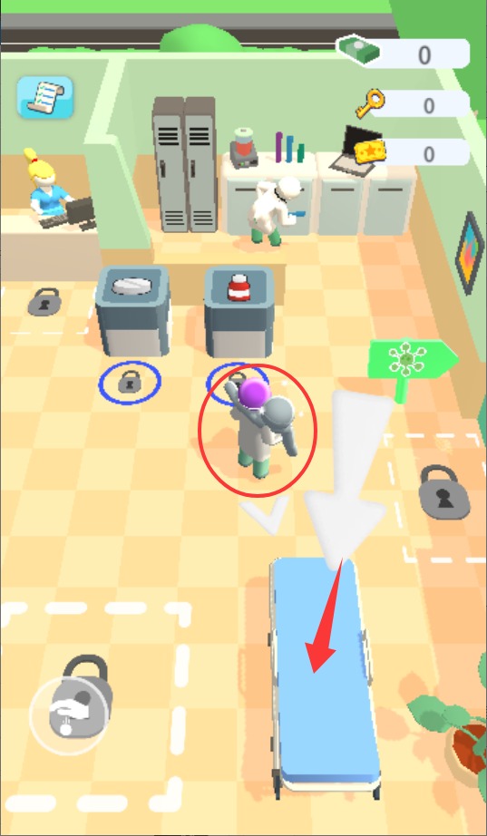 1、进入游戏后通过手指滑动屏幕控制医生角色移动,引导病人前往诊疗区域,熟悉基础操作流程。