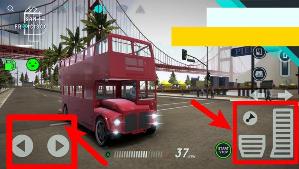 1.点击方向盘和踏板图标,精准控制巴士行驶,保证安全接送乘客到达目的地,顺利完成任务。