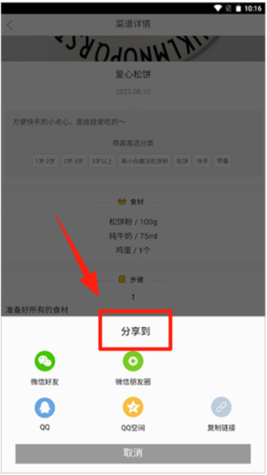 3、点击底部的分享还可以分享给好友,沟通学习更多孩子的辅食配方。