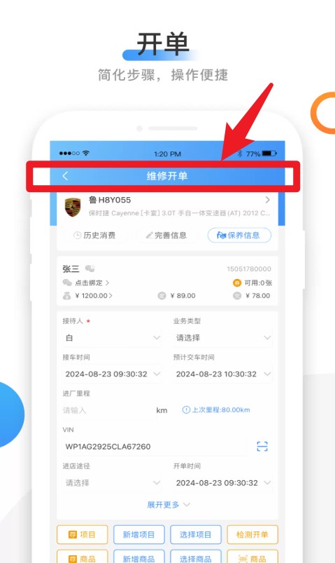 2、点击顶部的“维修开单”模块,填写客户信息、维修项目与时间,快速完成开单流程操作。