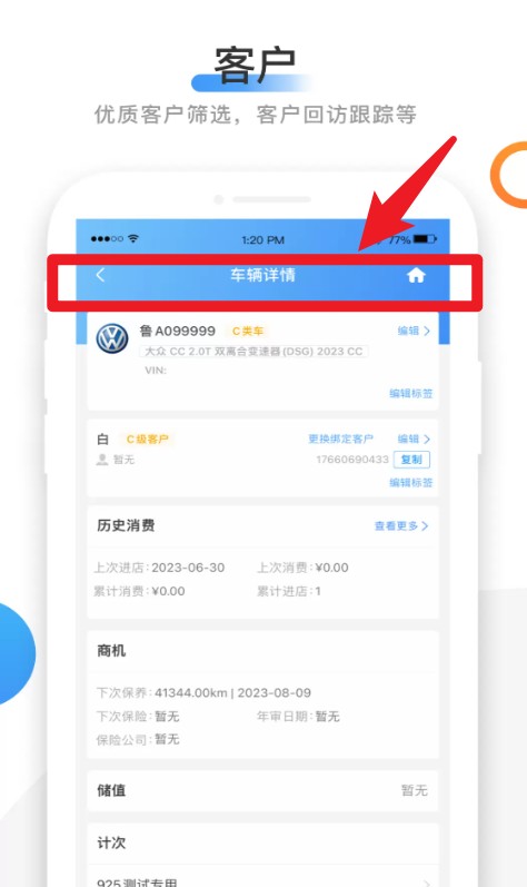 3、在“车辆详情”页面可查看客户车辆信息与历史记录,包括保养情况与当前客户等级分类。