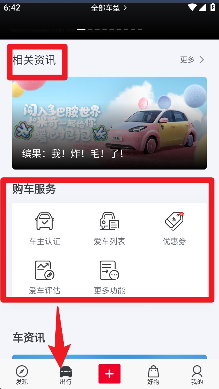 2. 点击底部“出行”栏目,可查看购车资讯、完成车主认证与车辆估值等服务操作。