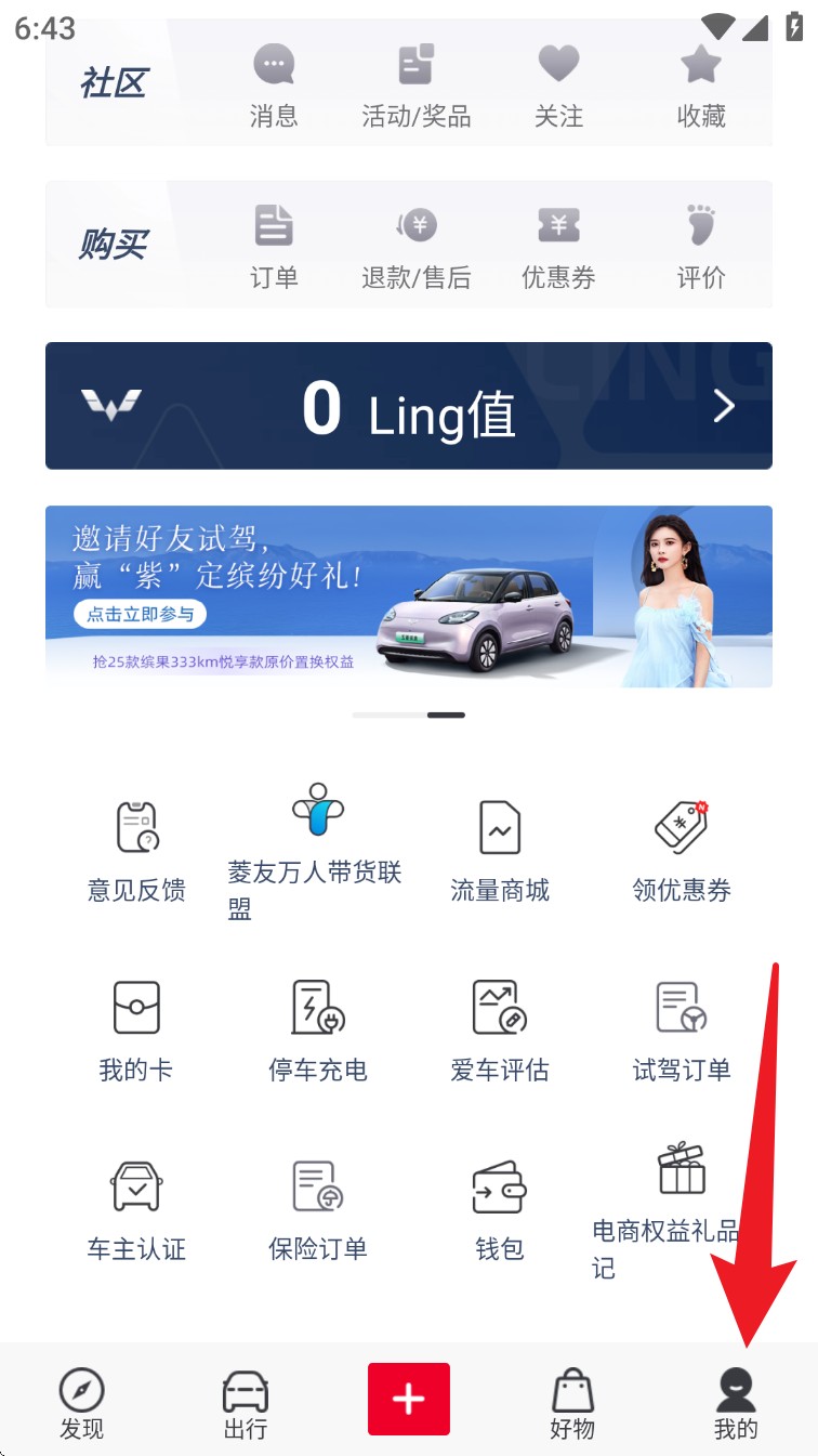 5. 在“我的”页面可查看 Ling 值积分、试驾订单、停车充值与钱包等个人资产信息。