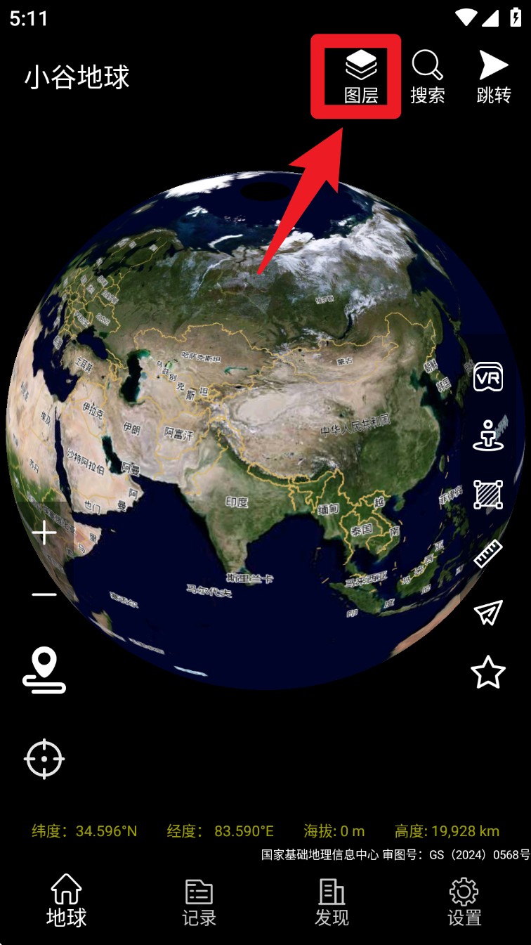 2. 点击右上角「图层」图标,进入地图设置界面,可选择不同类型的地图模式,如地形或电子地图。