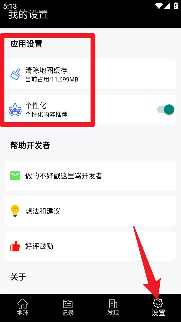 5. 进入「设置」界面后可清除地图缓存,并开启或关闭个性化内容推荐,管理使用偏好。