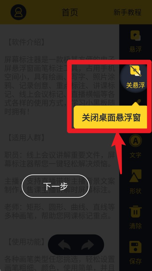 1、点击“悬浮”图标开启桌面悬浮窗,方便在其他界面上快速标注内容。