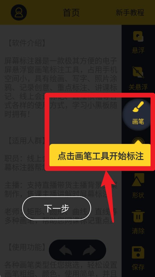 3、点击“画笔”按钮可启用绘图工具,在屏幕上手绘标记重点信息。