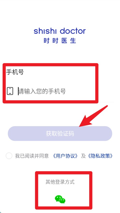 1、打开“时时医生”应用后,输入手机号并点击“获取验证码”即可登录,也可选择微信等其他方式登录账户。