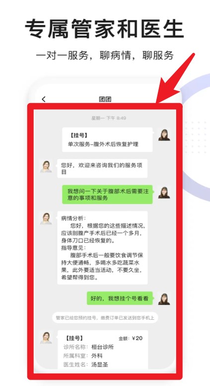 3、与专属医生或健康管家进行一对一图文聊天,方便咨询病情、恢复建议及服务内容,实现贴心健康管理。