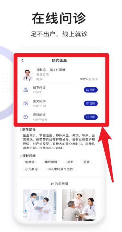 4、在“在线问诊”界面可选择线下、图文或视频方式预约医生,支持多位医生查看评价并自主选择挂号方式。