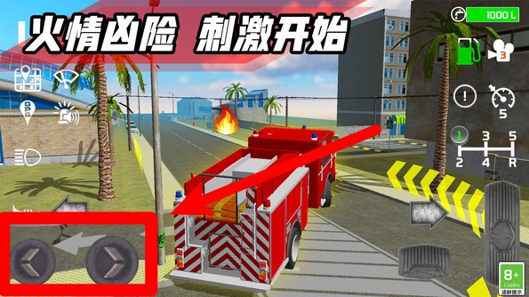 1.点击方向键控制消防车移动,迅速驶向火灾现场并调整方向,保持行驶速度稳定,避免发生碰撞。