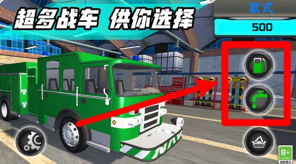 2.观察右侧界面油量和水量按钮,点击补充资源确保消防车任务持续进行,避免任务失败。