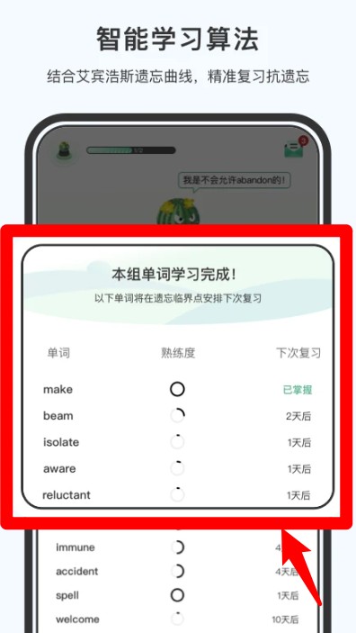 2、学习完成后系统会显示本组单词熟练度及下次复习时间,帮助用户科学安排复习进度。