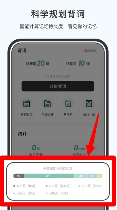 3、通过图表显示记忆持久度,区分不同记忆时长的数据,便于用户了解背词效果。
